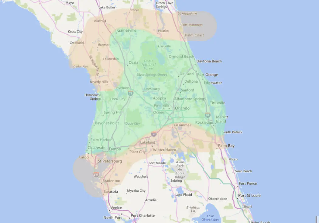 Bitte siehe dir die bereitgestellte Karte an, um zu sehen, welche Standorte wir für unsere vorgefertigten Pakete für Heiratsanträge bedienen. Für alle Bereiche innerhalb des grünen Overlays fallen keine zusätzlichen Anfahrtsgebühren an. Für Gebiete, die orange markiert sind, fallen zusätzliche Reisegebühren an.